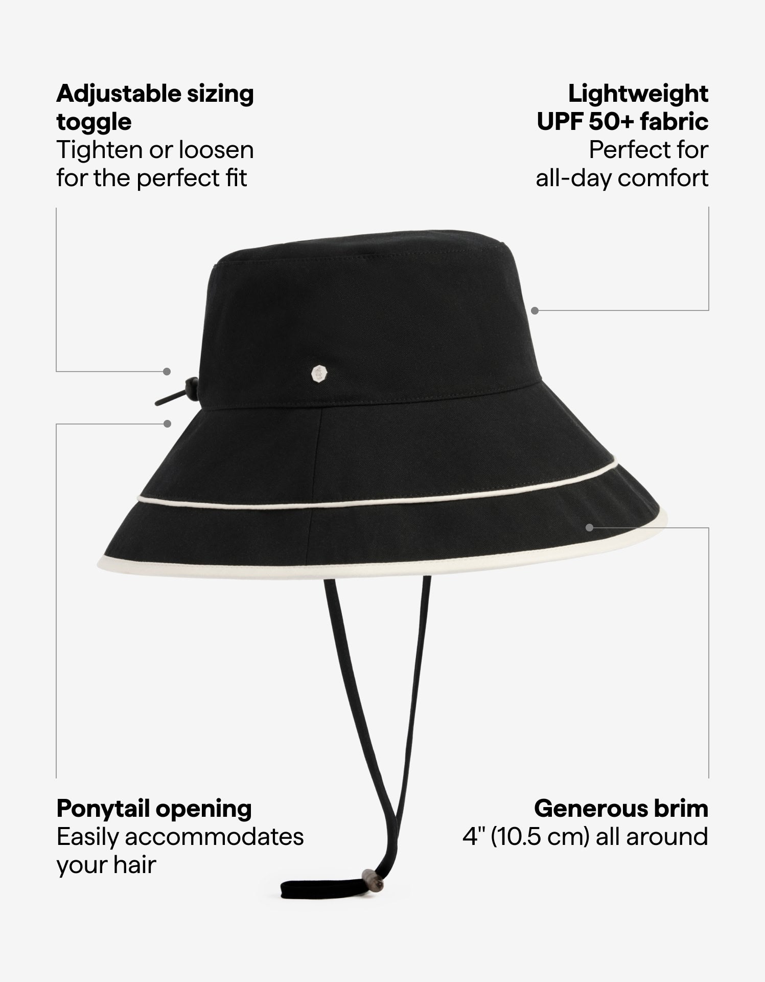 Our Vacation Sun Hat is a chic, packable UPF 50+ sun hat with a wide brim to keep your face protected from UV rays. With a ponytail opening and contrasting brim detail, it's a stylish option for every day sun protection.