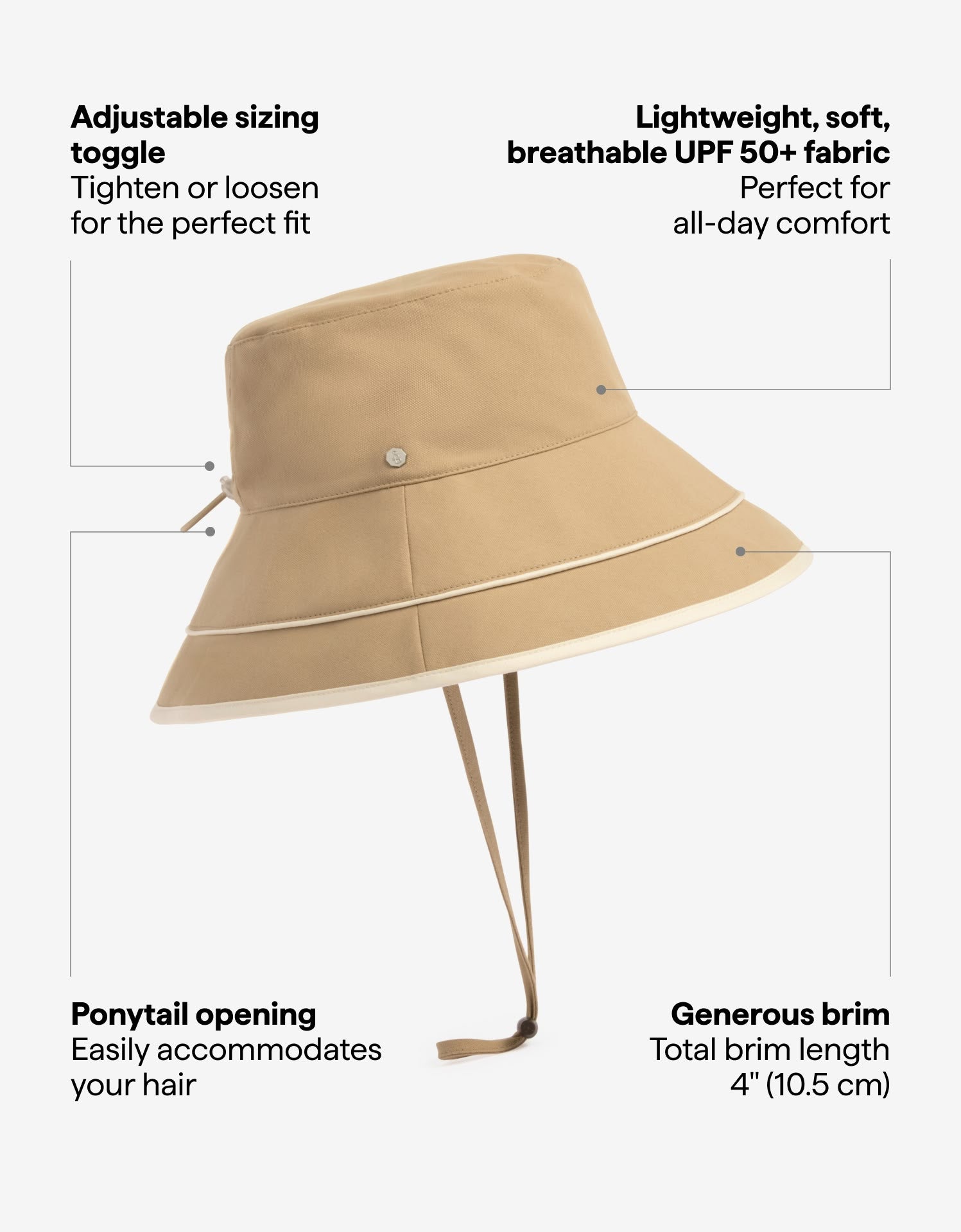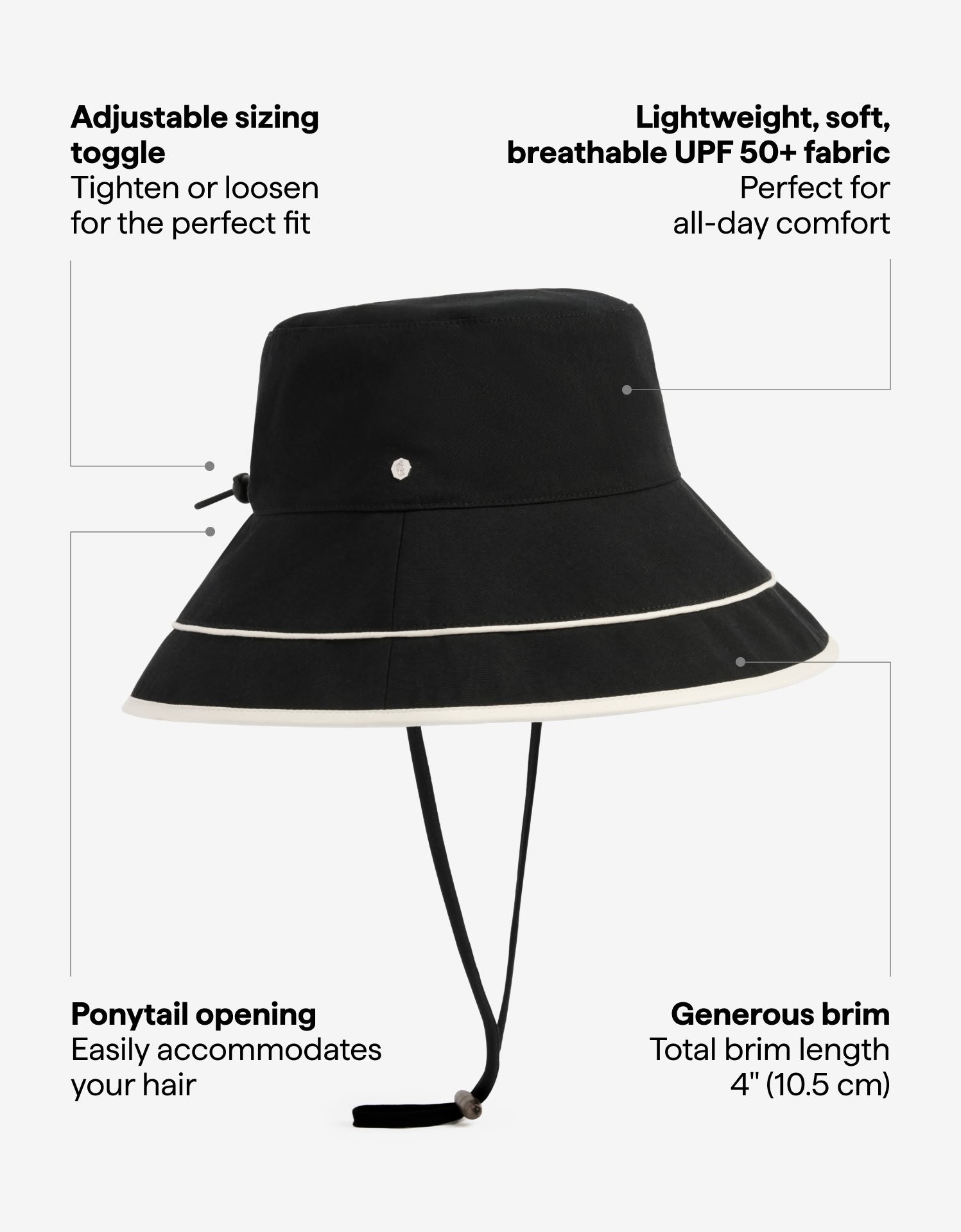 Our Vacation Sun Hat is a chic, packable UPF 50+ sun hat with a wide brim to keep your face protected from UV rays. With a ponytail opening and contrasting brim detail, it's a stylish option for every day sun protection.